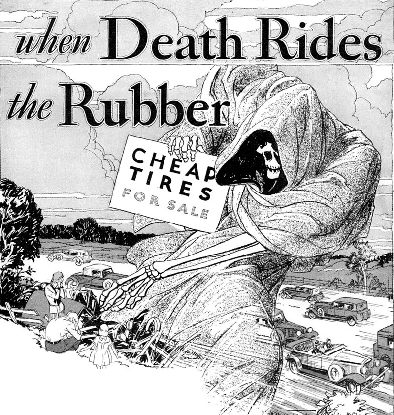 #vintage illustration #vintage ad #death #grim reaper #illustration #tires #ad