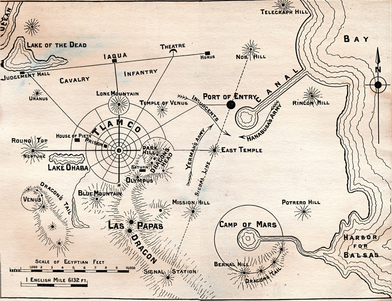 A map of the Atlantean city of Tlamco (now San Francisco).  From Yermah the Dorado by Frona Eunice Wait, 1897.