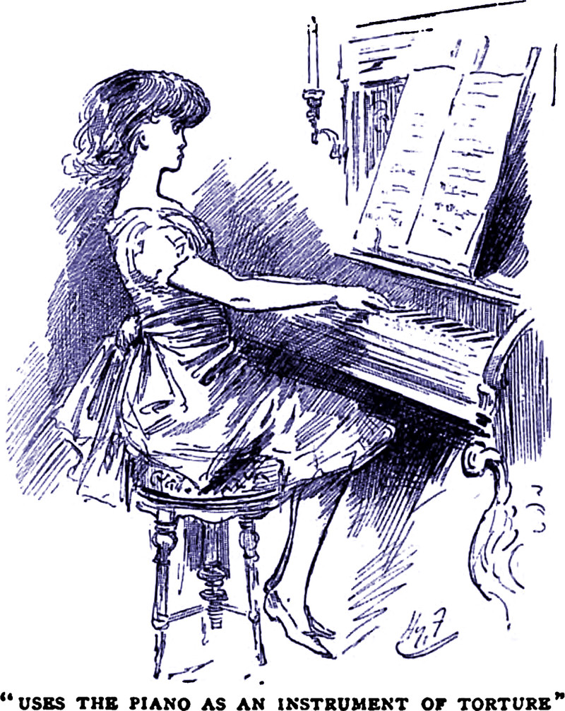 "Uses the piano as an instrument of torture."  From "On Grown-Up Babies and Other Human Phenomena" in Cassell's, 1888.