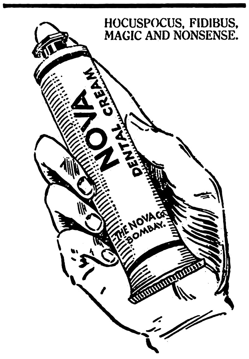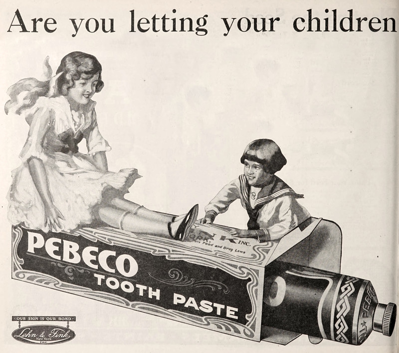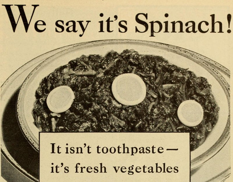 We presume this is a play on the famous New Yorker cartoon of 1928, in which a child won't eat her broccoli: "I say it's spinach and I say the hell with it." In this case, the subject is toothpaste, not broccoli (the ad is for Pepsodent). While we like the hallucinatory scenario (is one brushing one's teeth with spinach? Has one been served toothpaste for dinner?), the famous zinger to the gag is, "the hell with it," so this comes across as some sort of anti-advertising, since the lingering message is, "The hell with Pepsodent." From Photoplay, 1932.
