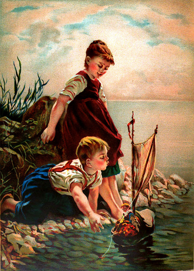 #vintage illustration #toy boat #seaside #children at play #doll boat #illustration
