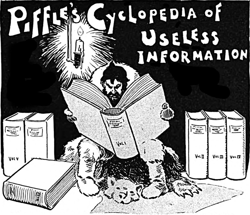 Here's a precursor by many decades to the useless information craze, from a 1909 issue of Puck magazine.  The caption reads: "Piffle's Cyclopedia of Useless Information."