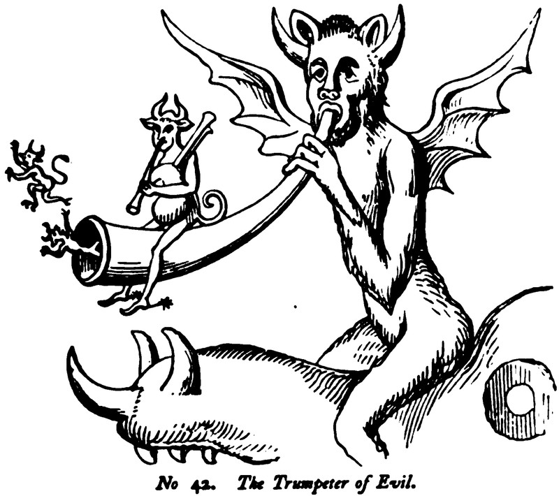 "The trumpter of evil."  From A History of Caricature and Grotesque in Literature and Art by Thomas Wright, 1875.  Speaking of which, what exactly are a snowball's chances in hell?  See A Snowball's Chance in Hell.