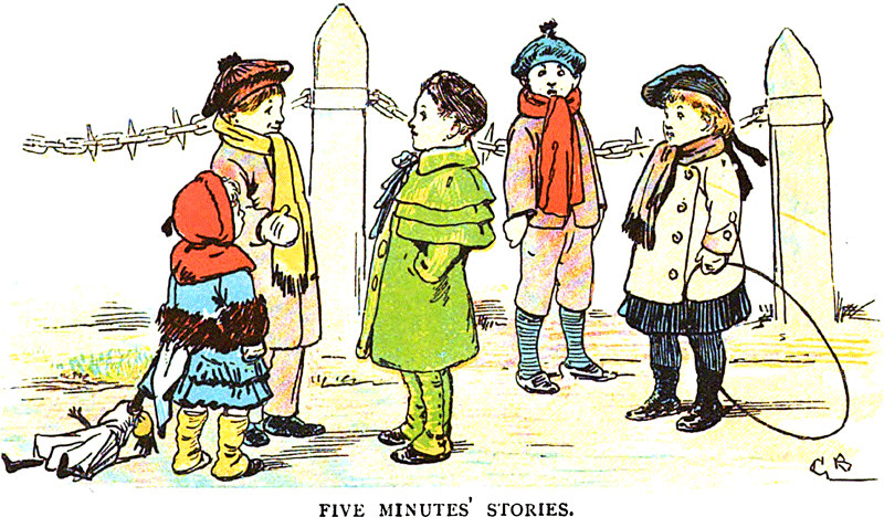 One hundred and eighteen years before Twitter, the immature gathered out of doors to exchange "five minutes' stories."  (The illustration is from Five Minutes' Stories by Mrs. Molesworth, 1888.)