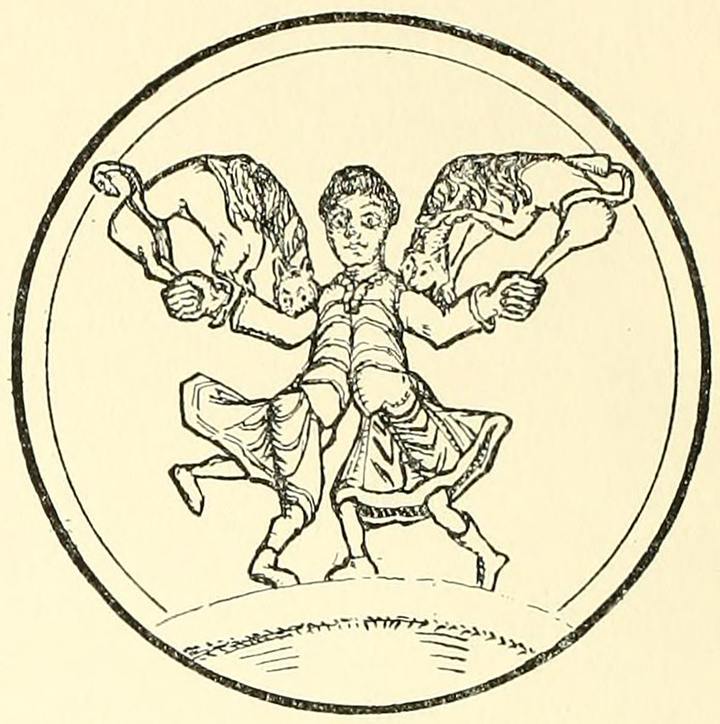 A double-bodied man juggles unrecognizable beasts.  From the Church of S. Pierre-en-Haute, 11th-12th century.  In The Burlington Magazine, 1903.