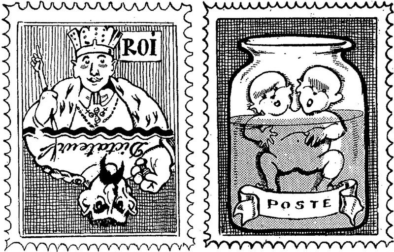 A fine line between a king and a dictator, plus a two-headed baby in a jar — on postage stamps.  From Le Journal Amusant, 1924.