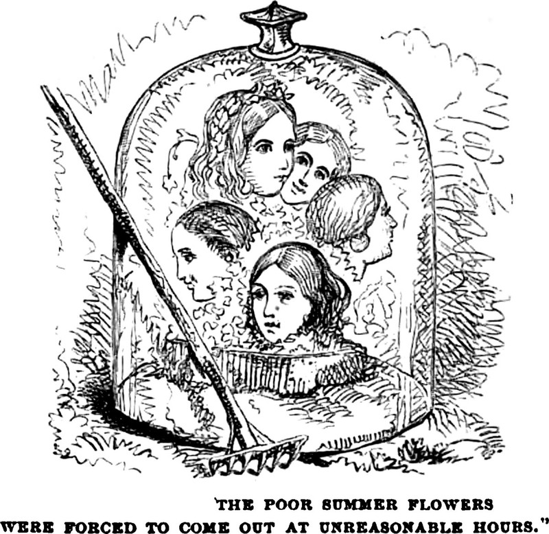 An illustration from an 1858 issue of Harper's magazine.  The caption reads: "The poor summer flowers were forced to come out at unreasonable hours."