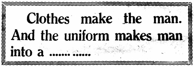 "Clothes make the man.  And the uniform makes man into a ____ ____."  From the Bombay Sunday Chronicle, 1945.
