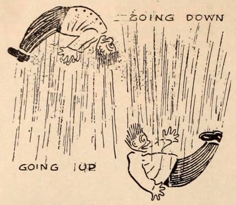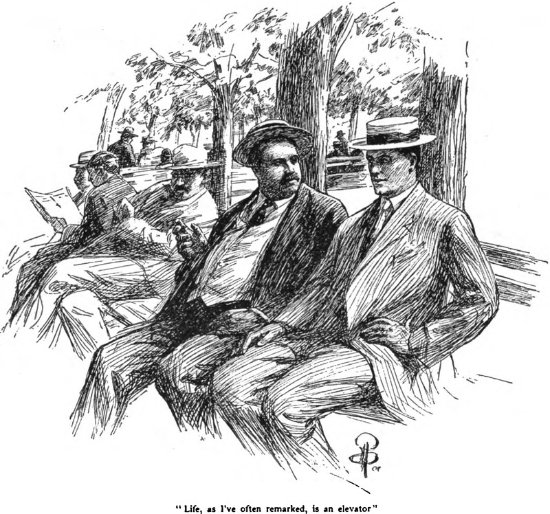 "Life, as I've often remarked, is an elevator." The speaker doesn't so much mean that life has its ups and downs but rather that one gets smacked into reverse repeatedly ("biff!" and "boomp!"). His companion replies that most well-conducted elevators have somebody inside to keep them "from biffing and boomping up and down to no purpose." The answer: "There ain't in life. Or if there is, he's drunk most of the time. Or else crazy." (From Pearson's, 1909.)