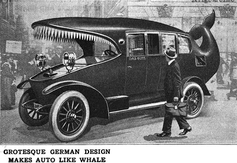 "Grotesque German design makes auto like whale."  From Popular Mechanics, 1920 (top) and 1914 (bottom).
