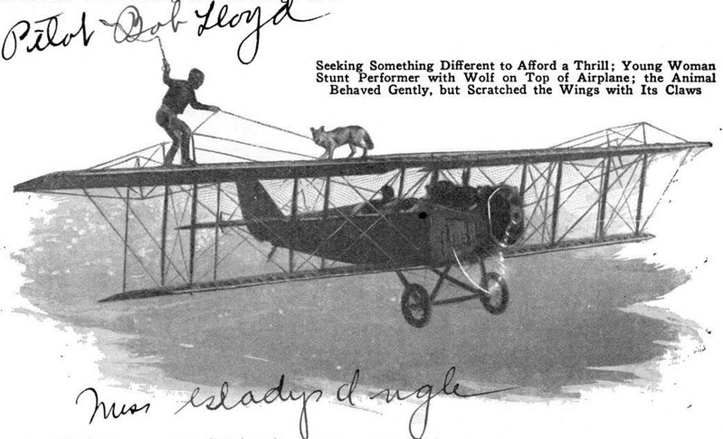 "Wolf ride on airplane wing."  From Popular Mechanics, 1927.