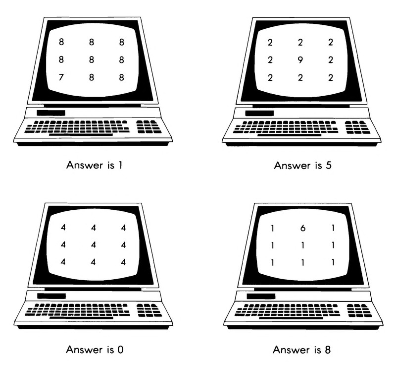 This illustration from an 80s computer gaming book offers a perplexing puzzle. How do the answers to each computer screen make sense?