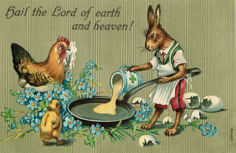 We get goosebumps and are filled with a humbling sense of wonder no matter how many times we witness the miracle of the birth of an Easter egg. This is a special illustration because it also shows the magic hat from which the bunny appeared. From Fliegende Blätter, 1928.