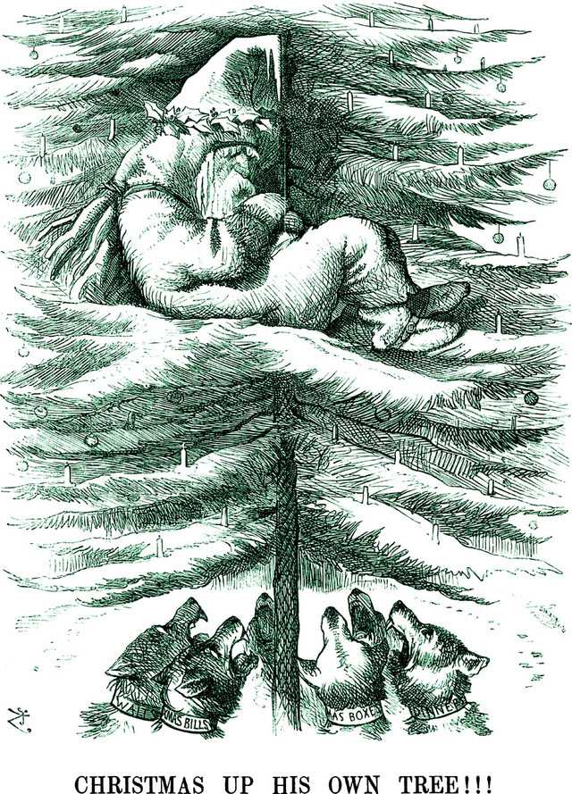 "Christmas up his own tree!"  An illustration from an 1874 issue of Punch magazine.
