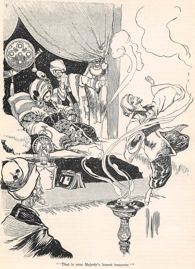 "The king had a vizier, who was avaricious, envious, and capable of every kind of mischief." From The Arabian Nights Entertainments, 1899.