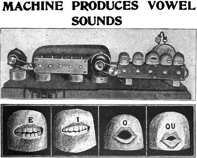 "Machine produces vowel sounds."  From Popular Mechanics, 1907.  This recalls Webster's Dictionary of All-Vowel Words (can you guess how great a many there are? Scrabble, anyone?)