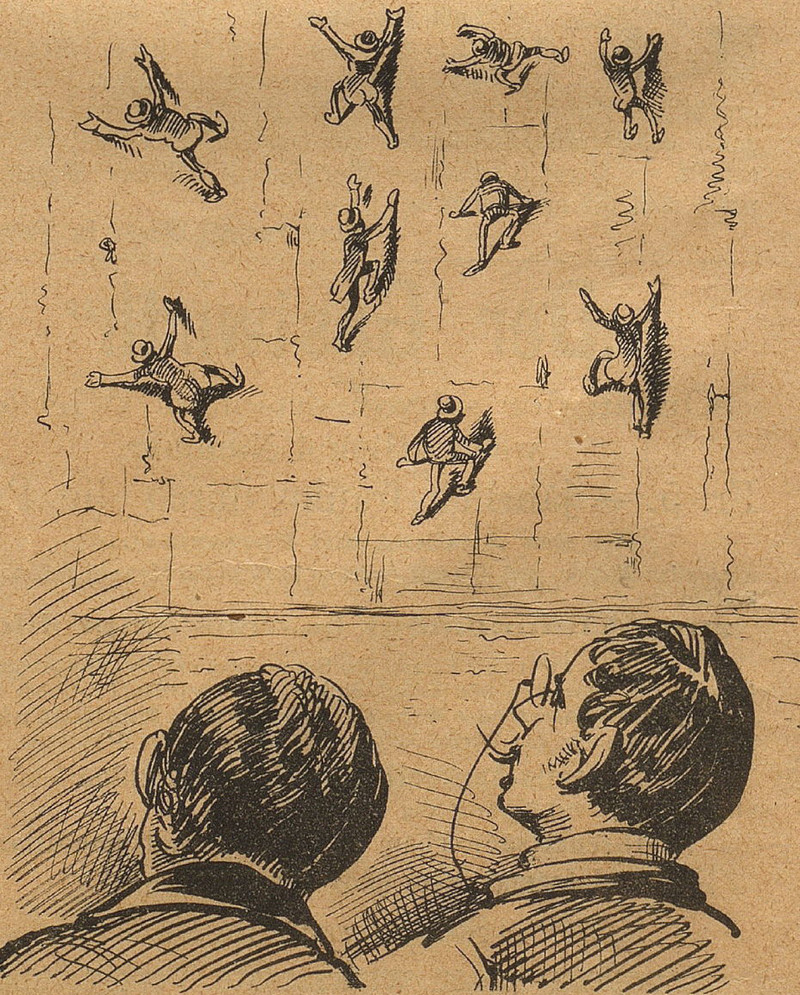 Here's a precursor to the novelty "sticky wall climber" toy.  From Nebelspalter, 1887.