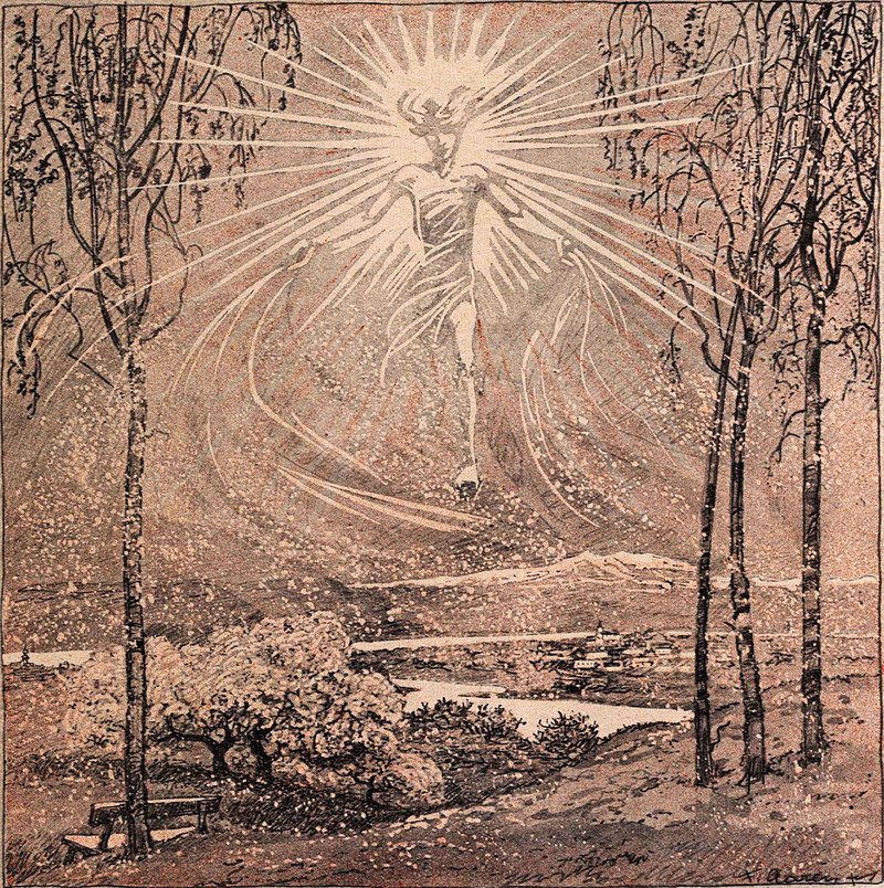 Atmospheric electrical discharges often get demonized, but they're sparked by an angel: "Nang Make Kala, an angel who causes lightning." From Five Years in Siam from 1891 to 1896 by Herbert Warington Smyth, 1898.