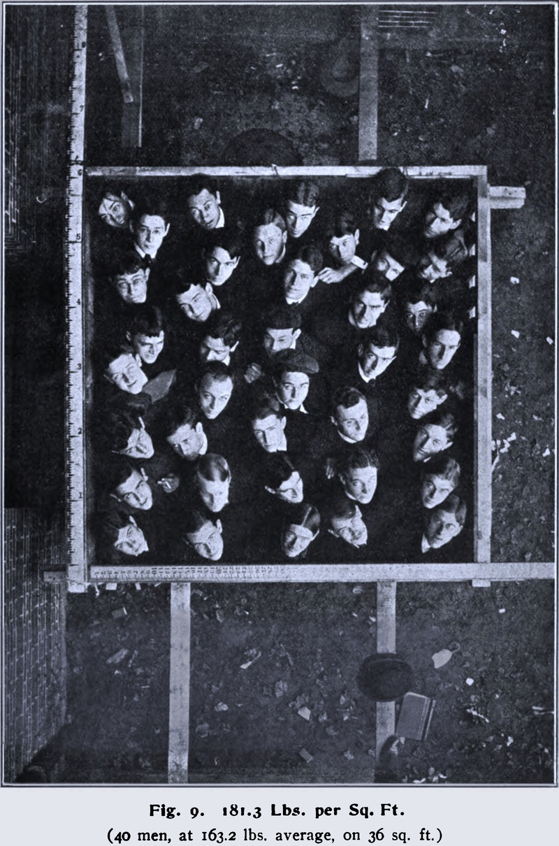 From New Data on the Weight of a Crowd of People by Lewis J. Johnson, 1905.  (Followed by a photograph of the apparatus they were standing in.)