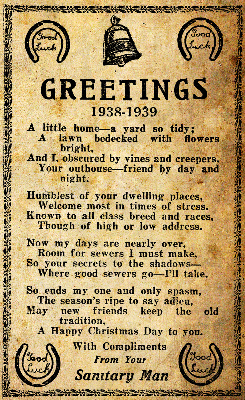 Here's how an outhouse overlaps with Christmas wishes. The talking outhouse is "obscured by vines and creepers" by day and night and confesses to taking the secrets you have hidden in the shadows with him to the "good sewers." His "one and only spasm" of the year is accompanied by lucky horseshoes. From Queensland, 1938.