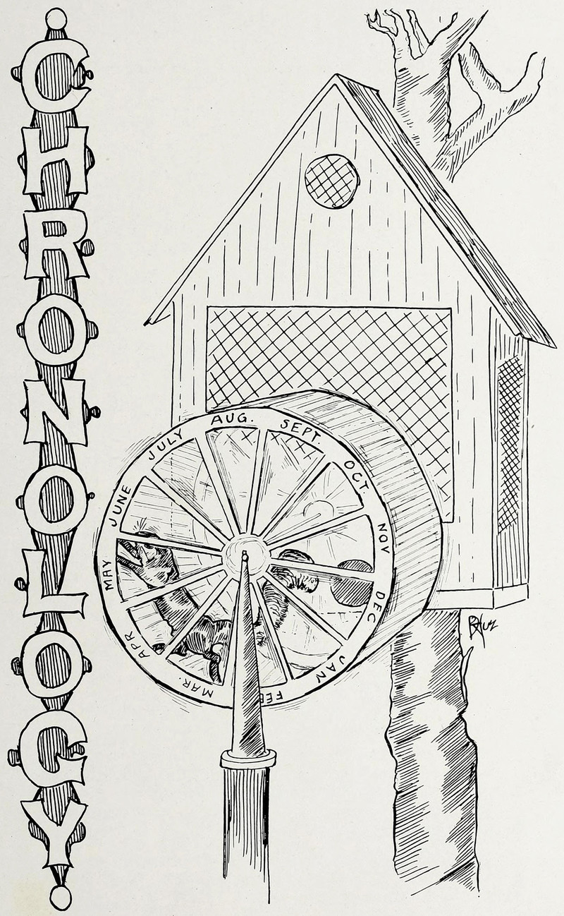 A squirrel turns the year. We, too, adopted squirrel time and have never looked back.  From Monmouth's 1910 yearbook.
