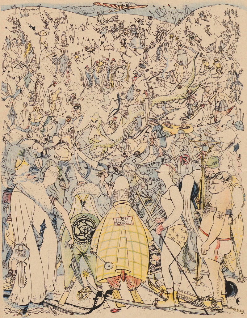 Where's Waldo. There are actually two figures wearing red-striped shirts hidden within the image. Also don't miss the giant cat on skiis, the lady with a "no parking" sign on her derrière, the angel on a hobby horse, the sun itself on skiis, as well as the two knights in armor and the frog skiing. Jeannie from