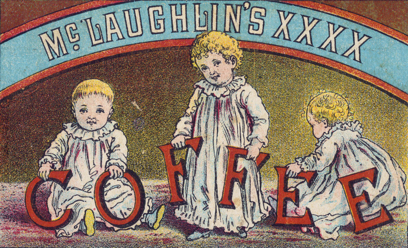 Barrels of whiskey and moonshine are traditionally labeled with X's (one X being weakest and three X's being strongest, as we learn in One-Letter Words: A Dictionary). But lesser-known is that coffee used to be roasted to a XXXX strength. Our vintage coffee ad is from c. 1890. The four X's on the vintage Coca Cola postcard below are, we think, unrelated.