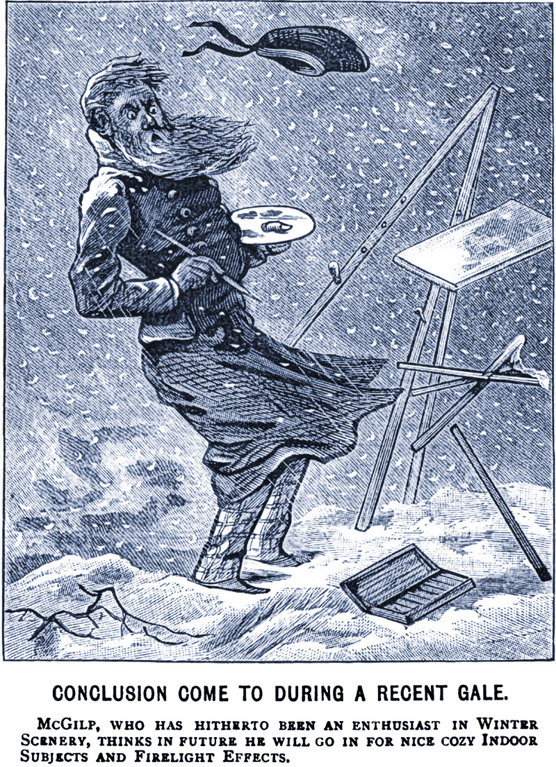 Hitherto an enthusiast in winter scenery, he thinks in the future he'll go in for nice cozy indoor subjects and firelight effects. From Judy, Or The London Serio-Comic Journal, 1882.