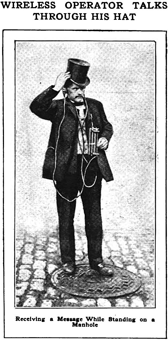 "Receiving a message while standing on a manhole."  From Popular Mechanics, 1911.