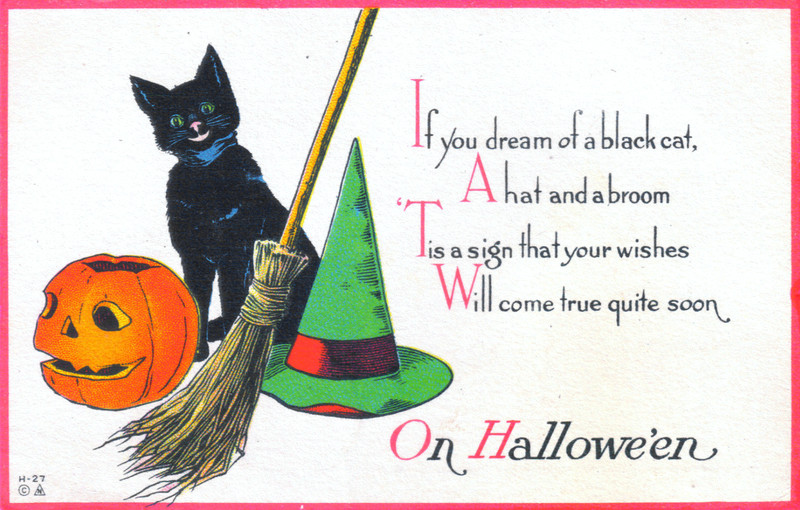 "If you dream of a black cat, a hat and a broom, 'tis a sign that your wishes will come true quite soon."  Date uncertain.