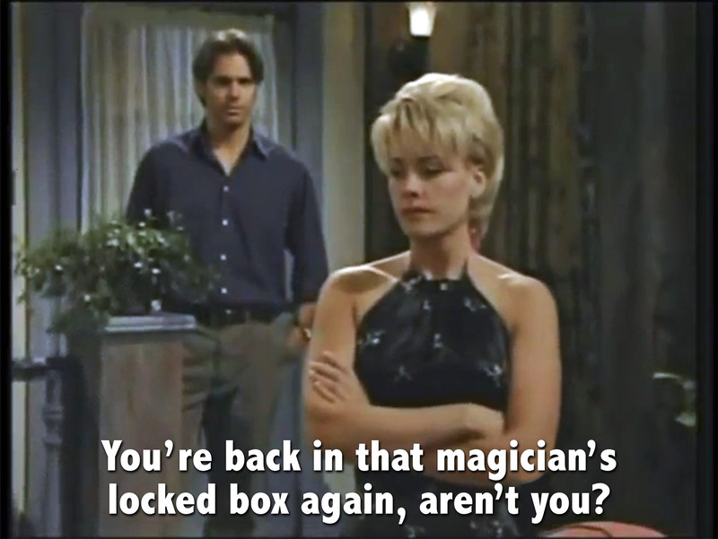 That feeling when you're back in the magician's locked box.  The subtitle reads, "You're back in that magician's locked box again, aren't you?"  From Passions episode 48.