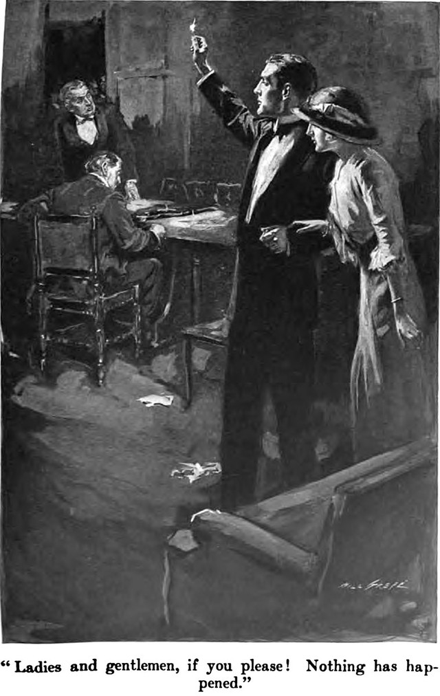 An illustration from An Amiable Charlatan by Edward Phillips Oppenheim (1916).  The caption reads: "Ladies and gentlemen, if you please!  Nothing has happened."