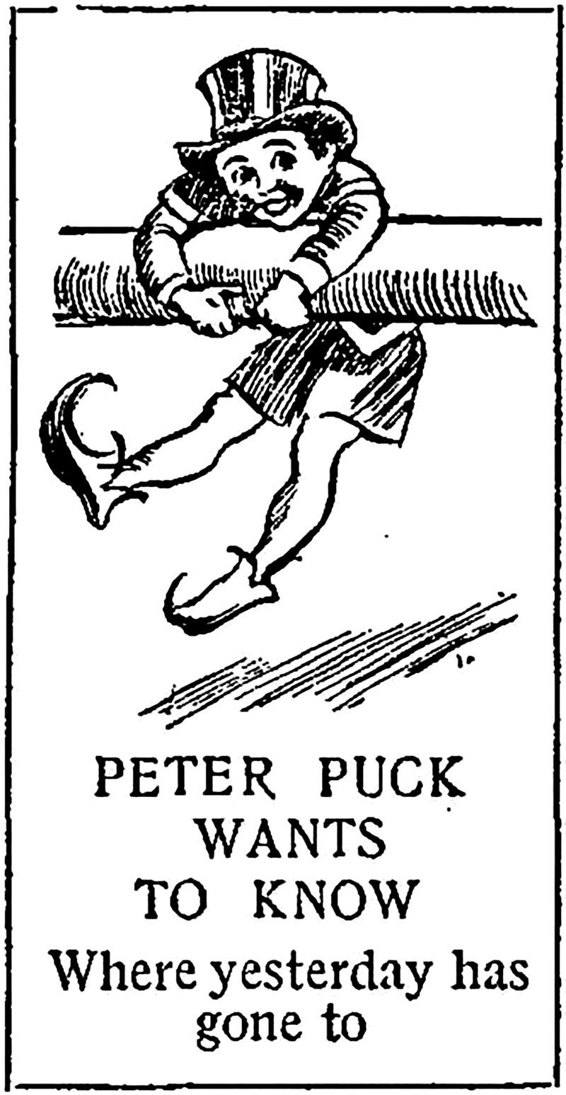 "Peter Puck wants to know where yesterday has gone to."  From The Children's Newspaper1927.