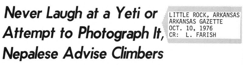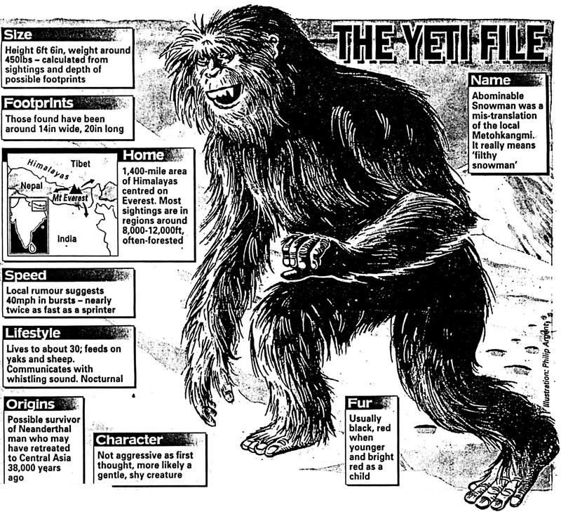 "Himalayan footprints mystery." From the Bombay Sunday Chronicle, 1949. By the way, it actually exists: the Bigfoot Bible.