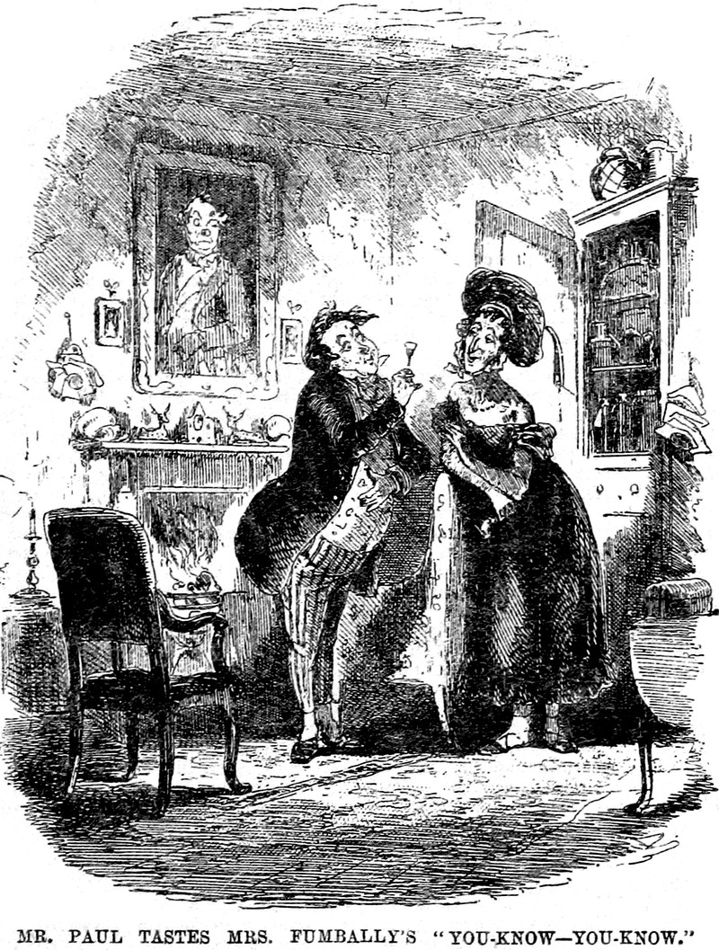 "Mr. Paul tastes Mrs. Fumbally's 'You-Know—You-Know,'" from Dicks' English Library of Standard Works, 1884.
