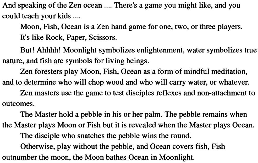 We were surprised to encounter the Zen game we invented, Moon Fish Ocean, described in a novel entitled The Woman Who Woke Up In The Zen Forest, by Martin Avery (2010).  Perhaps a footnote might be in order for the next edition, Mr. Avery?  ;-)  Otherwise, glad to see that the game is inspirational!
